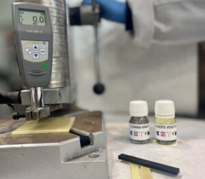 To guarantee the performance of the final products, we investigate each and every one of the biocomponents (matrices, fillers and additives) through different tests, such as the ‘Shore’ hardness test in which we are using a PCE Ibérica durometer.